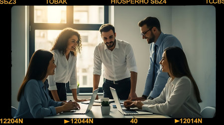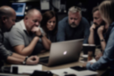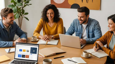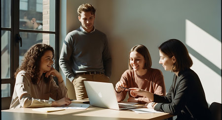 Collaborative team meeting in modern office, featuring six professionals engaged in discussion around laptop. atmosphere is positive and focused, showcasing teamwork and creativity