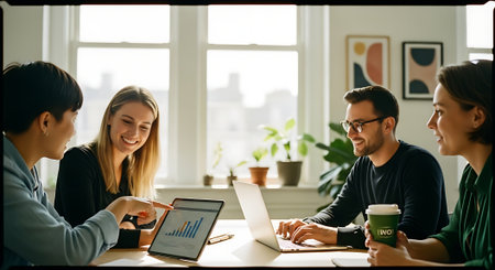 A group of four colleagues gathered around a table in an office, engaged in a meeting with laptops and a tablet, surrounded by a window with natural light.