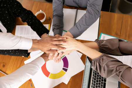 Successful joint work together of interracial team, sitting in white office, joint hands, togetherness
