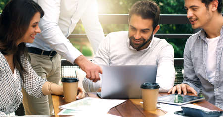Group of young multiethnic business people using digital tablet and laptop computer while working in office