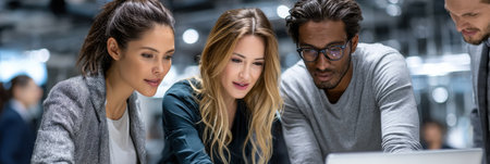 A diverse team collaborates around a laptop in an office. They discuss strategies, share insights, and demonstrate teamwork in a professional environment.