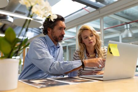 Side view of Caucasian male and female graphic designers discussing over laptop at desk in office. This is a casual creative start-up business office for a diverse team