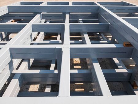 Stacked metal frame of a pre-fabricated building. Fast-built camp construction parts.