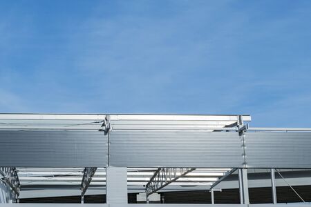 Steel frame workshop is under construction against a blue sky. New technology steel frame for construction