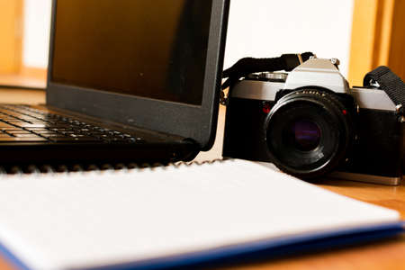 workplace with laptop, camera, notebook and coffee cup on wooden table