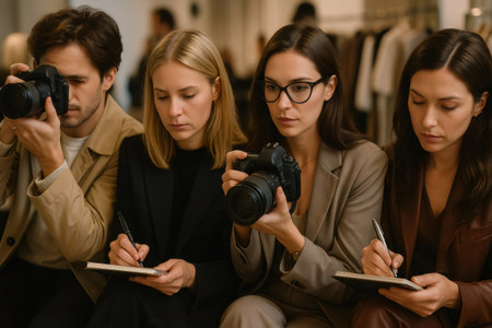 Group of professional photographers working at a fashion event, taking photos and writing notes on their notepads