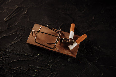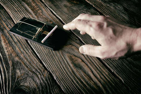 Two cigarettes on a mouse trap. Dangerous habbit concept