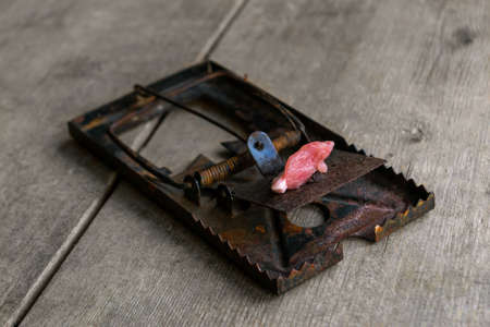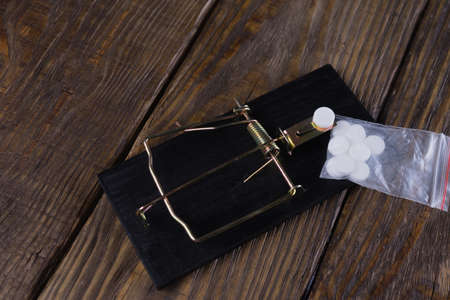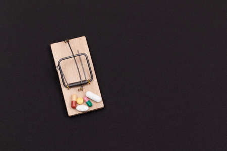 Drugs trapped in a mousetrap. Concept of drug addiction. Copy paste.