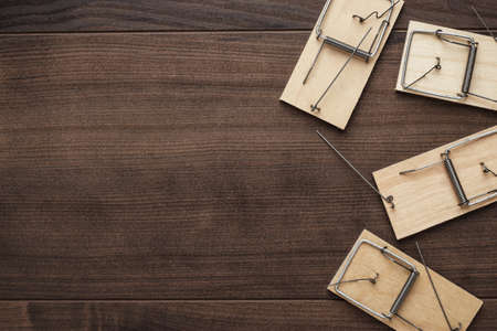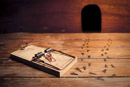 Mousetrap on an old wooden table. Metal accessories for extermination of small rodents. Dark background.