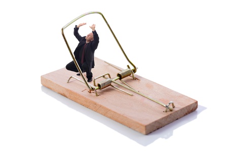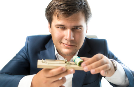Isolated closeup photo of man in suit taking money out of mousetrap