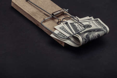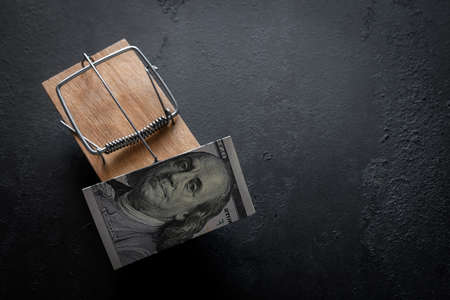 Mousetrap with dollar bait on black background. Trap or deception concept