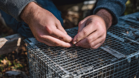 Closeup of hands checking and resetting traps in a suburban backyard illustrating yearly maintenance and ecofriendly rodent prevention tactics.