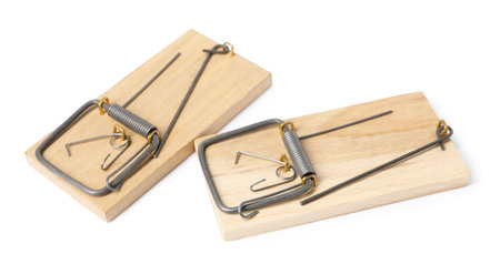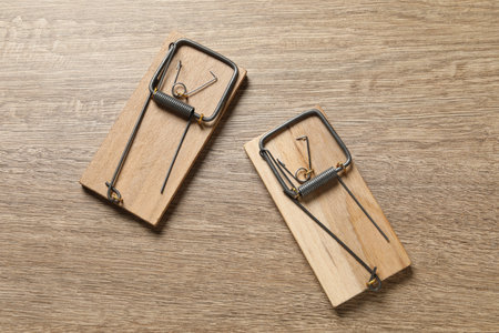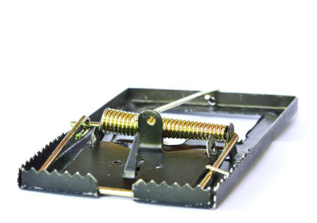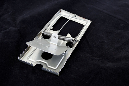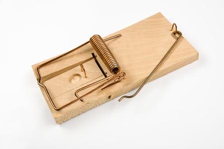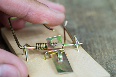 Close-up of a mousetrap, highlighting the metal spring and trigger mechanism, ready to snap