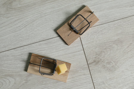 Spring-loaded bar mousetraps with piece of cheese on floor, flat lay