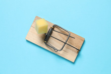 Spring-loaded bar mousetrap with piece of cheese on light blue background, top view