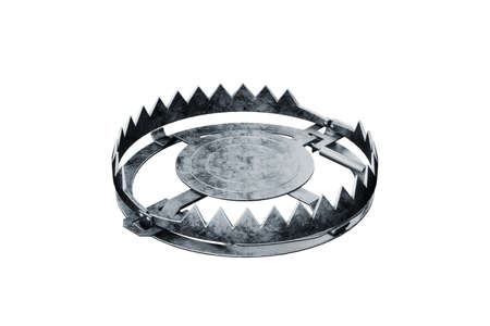 Bear trap isolated on white background, metal trap. Addiction, hunting, poaching, credit mortgage. 3D rendering, 3D illustration