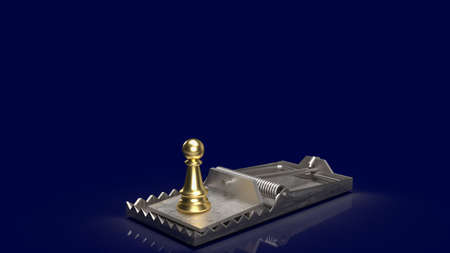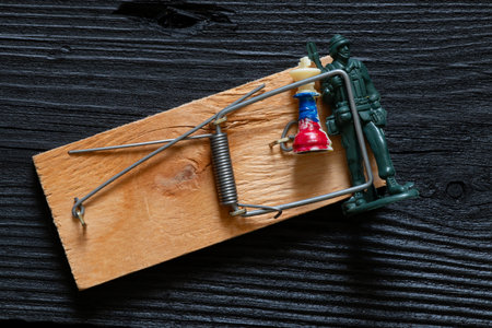 Plastic soldier and chess king in the colors of the Russian flag in a mousetrap on a black wooden background on the theme of war and traps