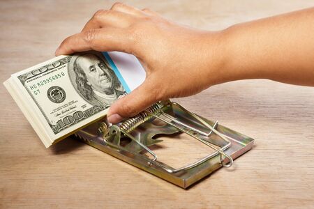 Conceptual photo of banker offering risky investment. Man holding mousetrap with money