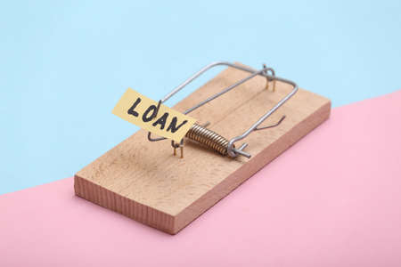 Mousetrap with loan bait on blue-pink pastel background. Traps, risks or deception concept