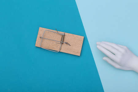The mannequin's hand reaches for a mousetrap on a blue background. Trap concept. top view