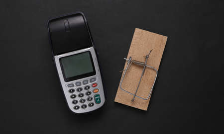 Payment terminal and mousetrap on a black background. Cheating and fraudulent payment