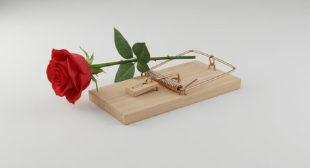 A vibrant red rose, symbol of love and passion, rests on a classic wooden mouse trap, highlighting the concept of beauty concealing hidden danger or risk in relationships. A striking metaphor for love