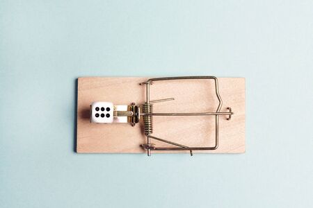 Playing dice on mousetrap on a blue background. Gambling addiction concept. Copy space text.