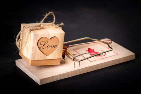 A box with the word love placed in a mousetrap. Love for a person with bad intentions. Dark background.