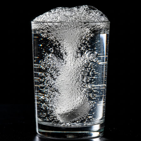 This striking image showcases bubbles rising in clear water within a glass, reflecting themes of purity and refreshment, perfect for beverage or wellness concepts.