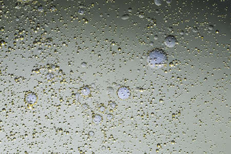 Close-up of foam structure on a glass surface. Glass on a black background. Foam bubble from soap or shampoo washing isolated on a glass. Creative photography