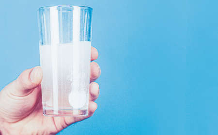 Closeup of effervescent tablet dissolving in glass of water on blue background