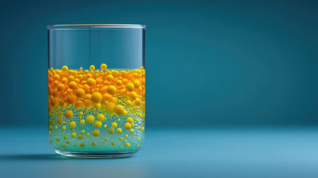 A striking visual of vivid orange and yellow bubbles suspended in liquid within a glass, showcasing the mesmerizing interaction of colors against a serene blue backdrop.