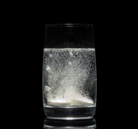 Aspirin dissolves in a glass of water on a black background in close-up.