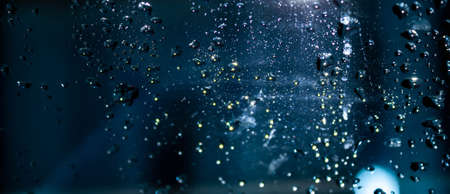 Banner Abstract real air water bubble through glass. Night life style dark green black depth mystery magic mood space experiment background design. Blue highlight illuminated round light glare effect