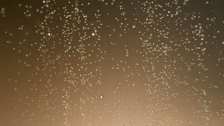 An enchanting display of water droplets sparkles as they fall, reflecting warm golden tones and cool blue shades