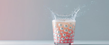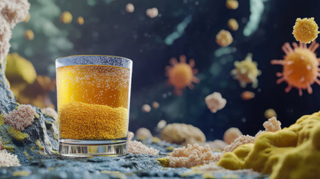 A captivating visualization of a glass of drink surrounded by surreal microorganisms, showcasing the intersection of biology and art. Configured in a dark environment, this image explores the microscopic world with vibrant details and textures.