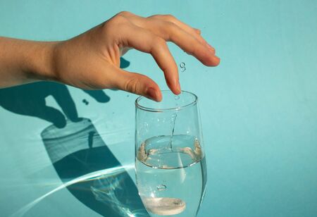 Against a blue background, a hand drops a dissolving fizzy aspirin tablet into a glass of water.