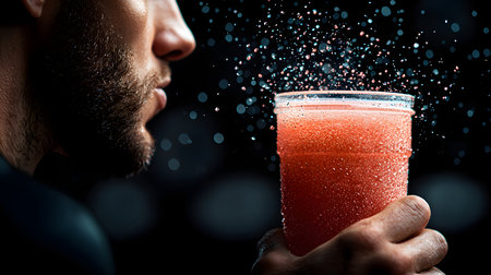 The image captures a man holding a sports drink, droplets glistening against a dark background. His intense expression suggests determination as he prepares to quench his thirst.