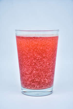 transparent glass with mineral water and effervescent tablet, on a red background with space for text, closeup image