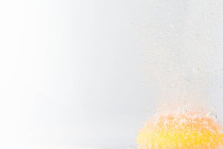 Yellow effervescent tablet in water with place for text