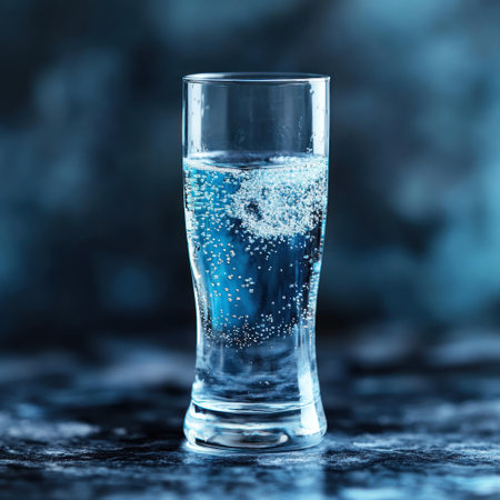 Clear glass filled with sparkling water showcases bubbles in a serene blue setting.