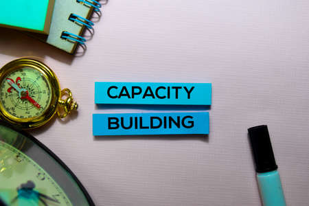 Wooden blocks with text - Leadership, Objective, Strategy, Planning. With alarm clock background