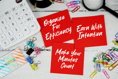 Organize For Efficiency, Earn With Intention, Make Your Minutes Count text written on paper note with calculator and magnifying glass on wooden background