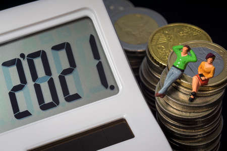 Income Tax Campaign 2021. Young Couple sitting on coin stack. Statement of income