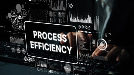 Businessman Analyzing Data with Process Efficiency Concept on Digital Interface in Modern Office Environment. Asymptotic smart data analytic.