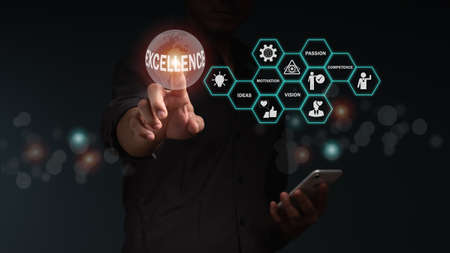 The businessman uses finger point to Excellence icon for business, competence, innovation, passion, service, and success for the best infographic concept.