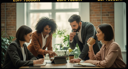 A diverse team of young business professionals collaborates in a modern office around a large, interactive smart table. They are analyzing data visualizations and charts on the digital screen, discussing strategy and ideas in a dynamic meeting.