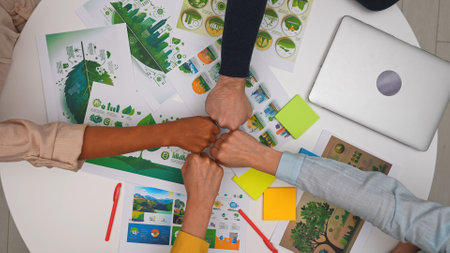 Top view creative project team meeting in boardroom at desk, discussing ecological project, presenting visual concept graphics, making team fist bump hand gesture.
