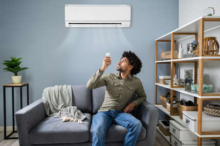 Young Happy Man Sitting On Couch Operating Air Conditioner With Remote Control At Home