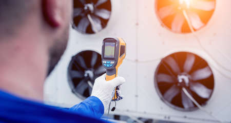 Technician uses a thermal imaging infrared thermometer to check the condensing unit heat exchanger.